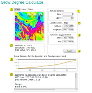 The GDC application calculates a location's accumulated grow degree value from historical WRF Hindcast data stored on our server. The user customizes the calculation request by entering temperature parameters, location, and run dates. The application determines which sector and data pixel to use, gets historical daily minimum and maximum temperatures, calculates and accumulates the grow degree units over the run dates given for the pixel location.